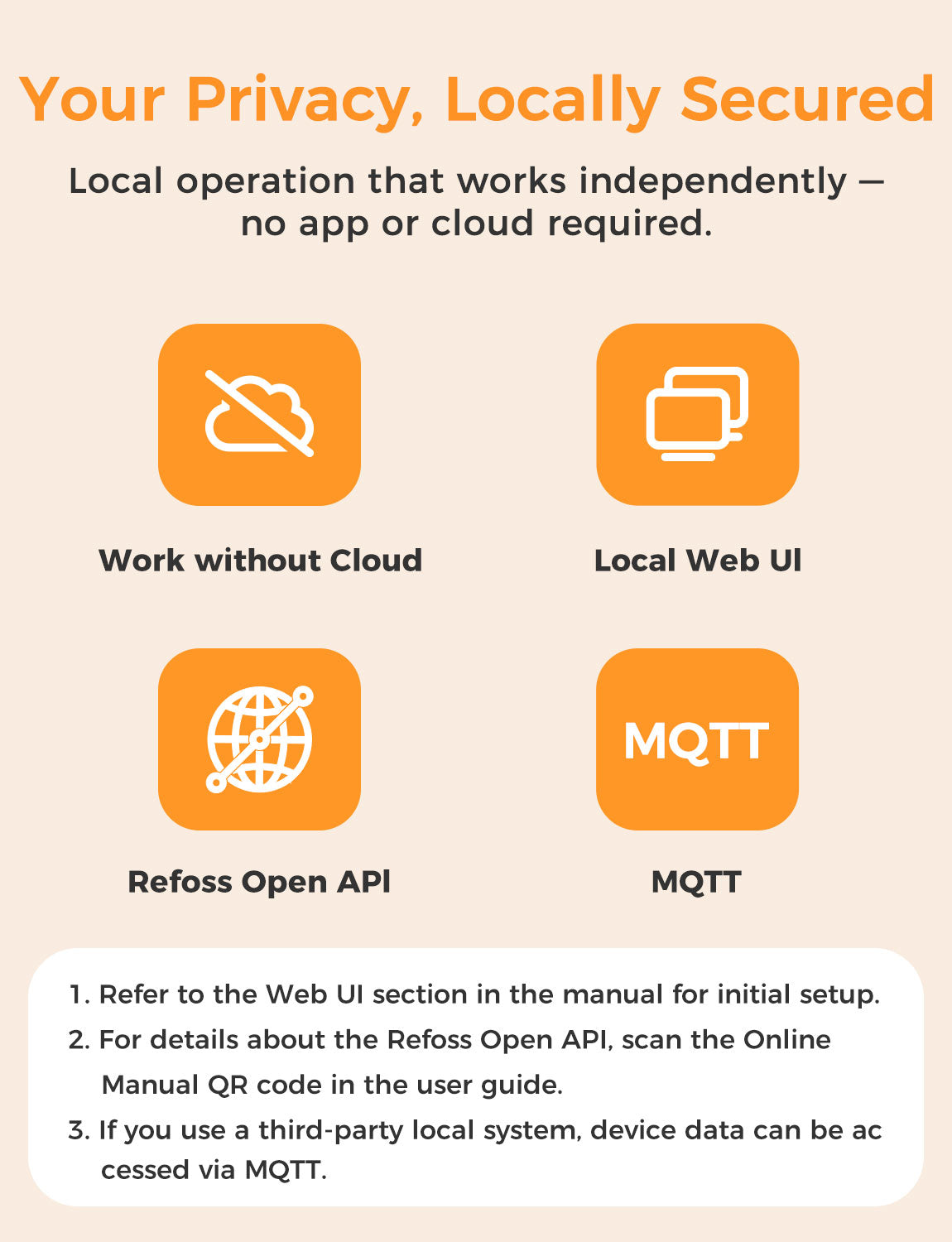 - Privacy-First Operation: Your privacy matters. The device can operate offline without cloud services, app download, or registration. Local Web access is supported, along with Refoss Open API and MQTT for seamless integration with third-party local systems.