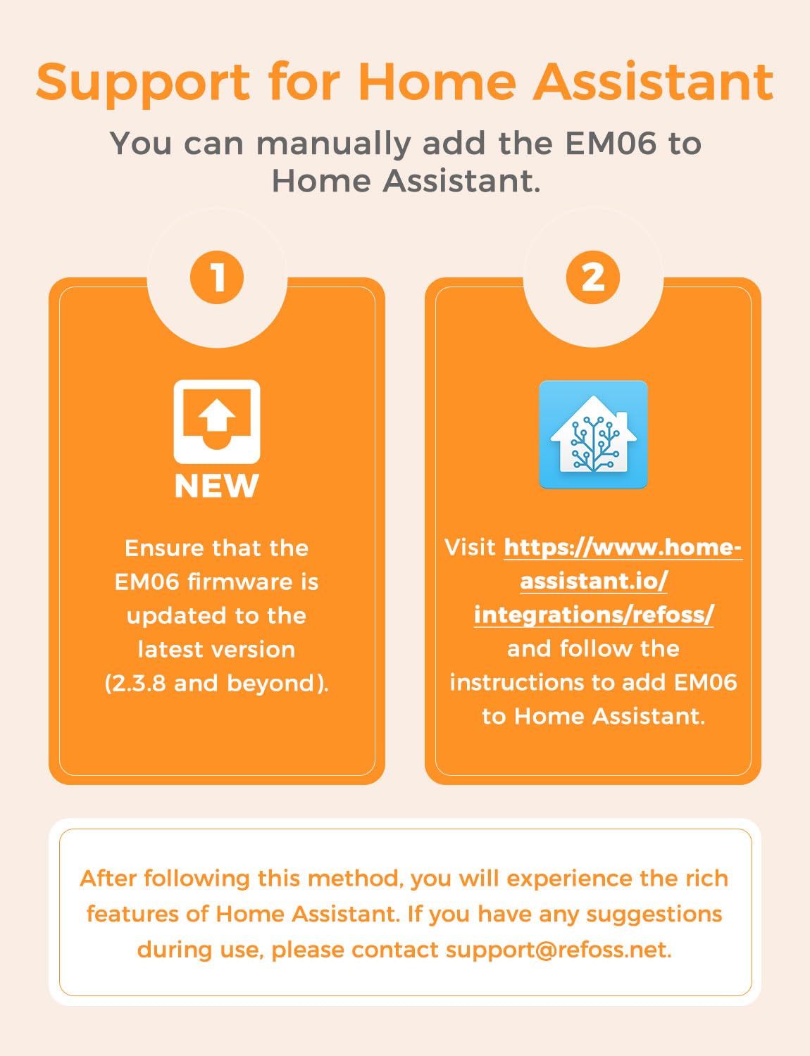 - Compatible with Home Assistant: The EM06 now works seamlessly with Home Assistant. Update to the latest firmware via the Refoss app for smooth integration into your smart home.