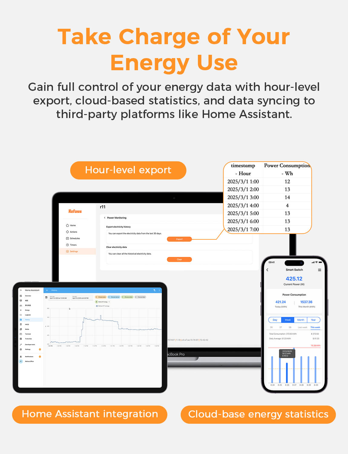 - Energy Monitoring: Track energy consumption in real-time with hour-level export and cloud-based statistics.